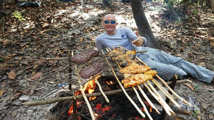 На все время пребывания в лагере у нас будет полный пансион: 3-х разовое питание. Завтрак в лагере. Полноценный обед в лодже или обед на рыбалке (салаты, бутерброды, барбекю из пойманной рыбы, овощи, фрукты), ужин в лодже. Также включено пиво.